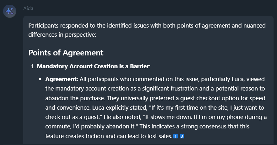 A simple summary prompt is a useful starting point because it provides direction without steering the analysis too early. It gives a clear sense of what the participants discussed, but without directing the structure or prioritisation.