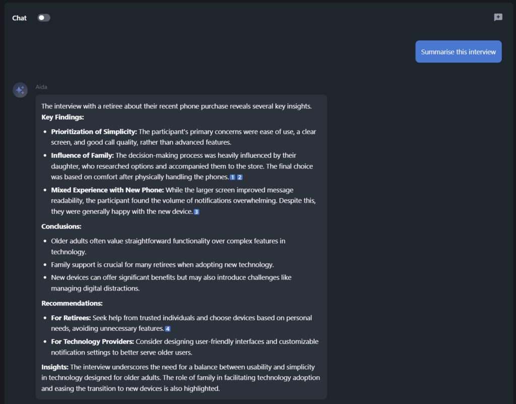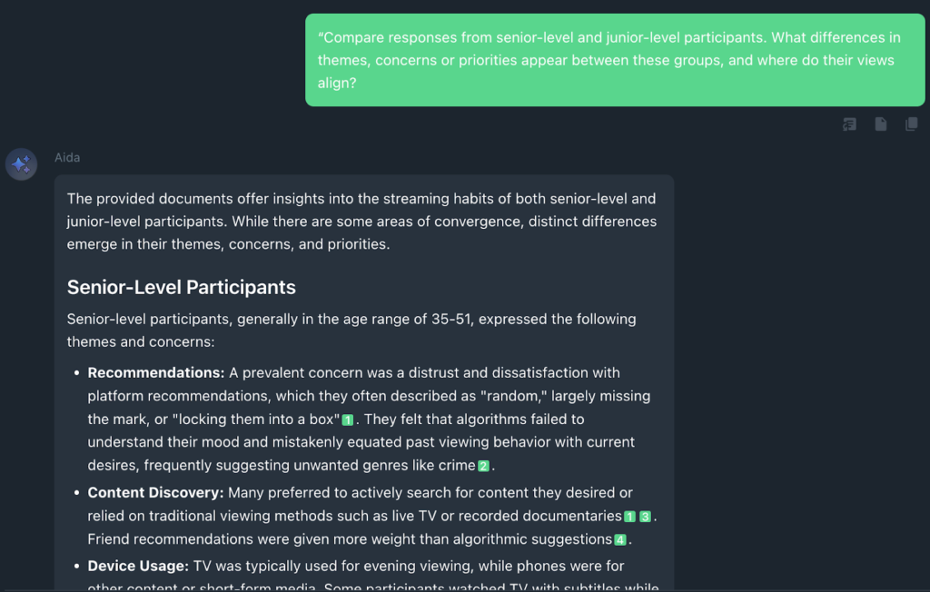 The prompts above are a great starting point for research, following a methodical strategy. However, in practice, qualitative researchers often move back and forth between the different stages, revisiting earlier questions or challenging ideas, as new patterns surface. What matters is not the exact wording of each prompt, but how it is used to manage scope and keep the analysis connected to the material. This is further supported by Beings, because each quote or viewpoint provided by Aida is linked back to a timestamped section of the audio or file.