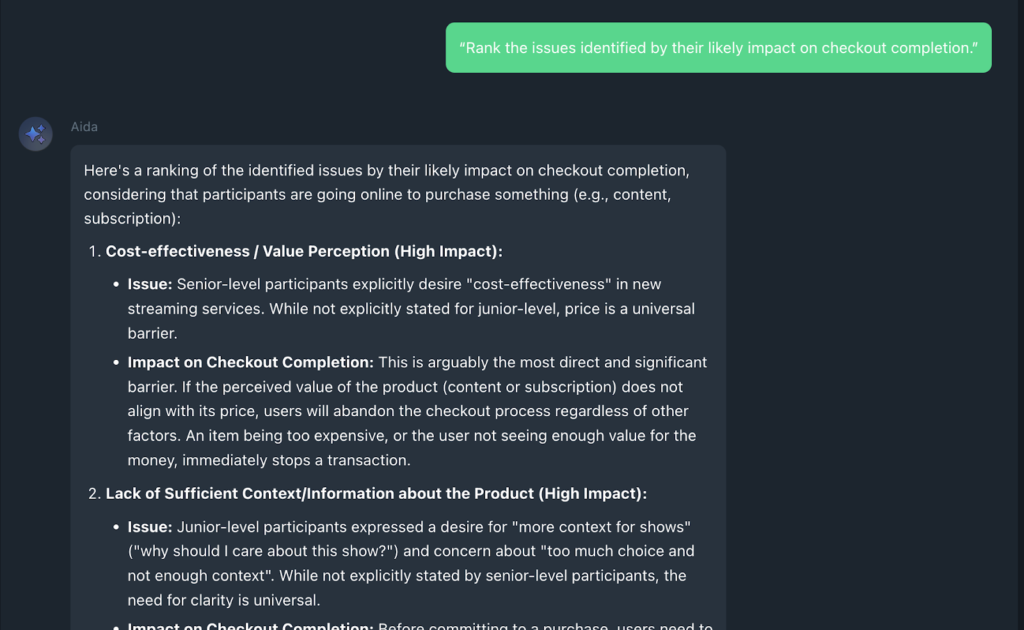 Once themes are visible, this prompt will help to prioritise what carried the most weight for participants. It shifts the analysis from listing issues to understanding which ones mattered most, without introducing any interpretation or recommendations too early.
