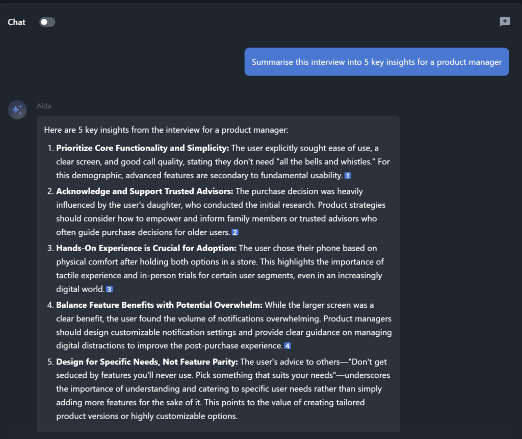 “Summarise this interview into 5 key insights for a product manager.”