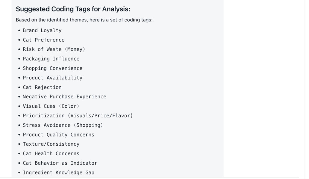 “Based on these themes, suggest a set of coding tags I can use for analysis.”Once the tags are returned, you review the list and decide whether the wording and scope match the focus of your study.