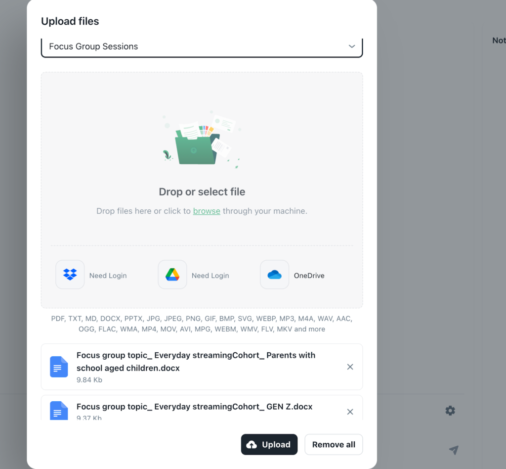 Bring audio or video files into Beings by uploading them directly, or by inviting Beings to the session so the material enters the system without passing through external tools. Check that the file appears in the intended project before moving on.