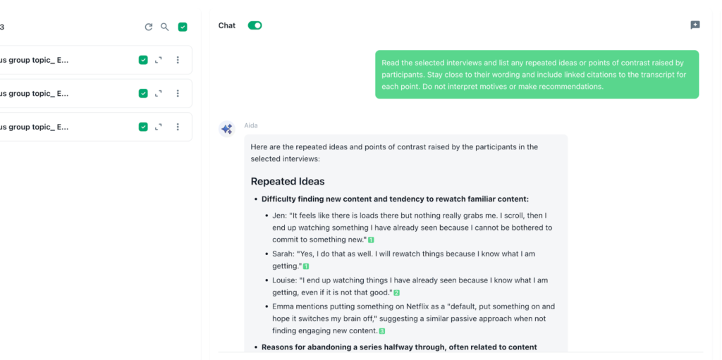 Select one recording or a group of recordings in the project so the analysis stays inside the correct space. Using conversational analysis, ask Aida for early patterns, repeated ideas or points of contrast across the selected interviews. Aida will surface suggestions with linked citations from the transcripts, and you can use these to guide your first round of interpretation while keeping full control over which directions to develop.