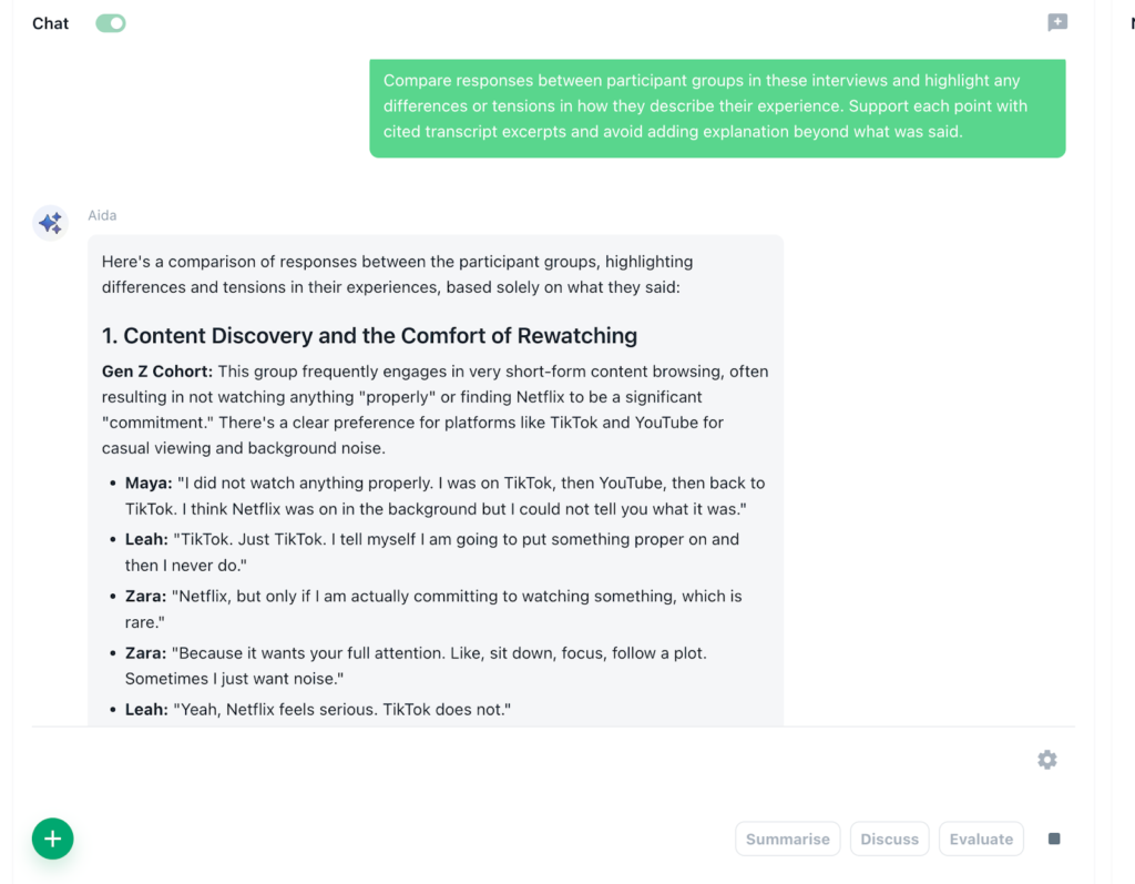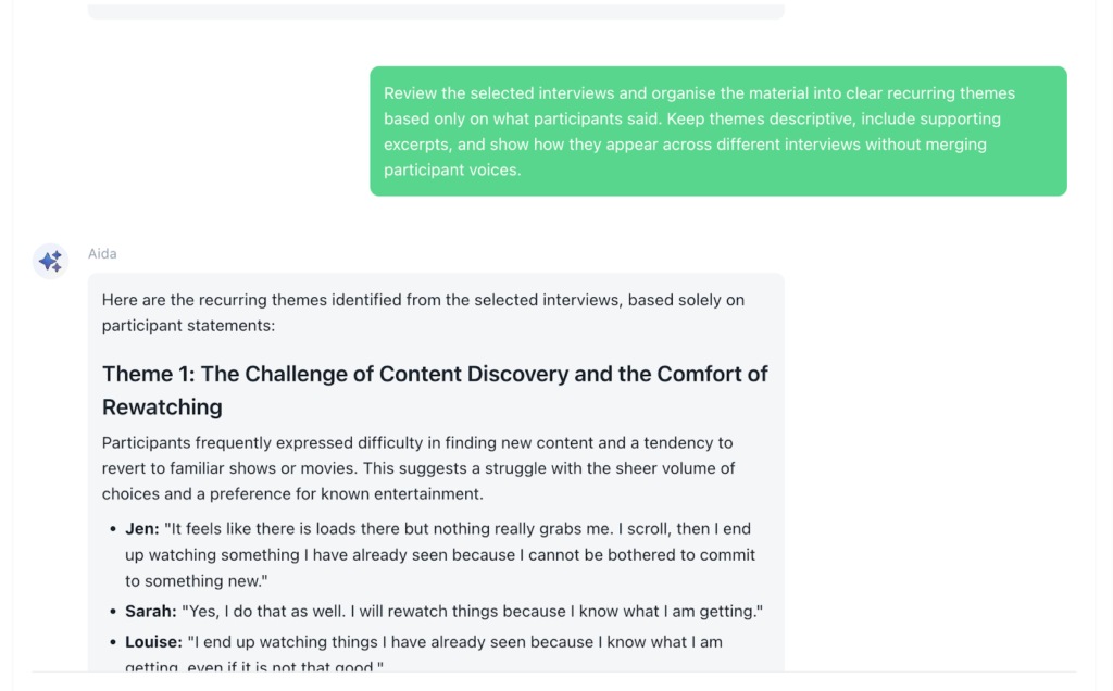 Ask Aida to surface differences between participant groups, highlight tensions in customer statements or bring together citations that support early themes, all whilst keeping the information secure. Review each suggestion carefully and develop the directions that align with the aims of the customer research, maintaining human judgement throughout so the interpretation stays accurate and grounded in the source material.