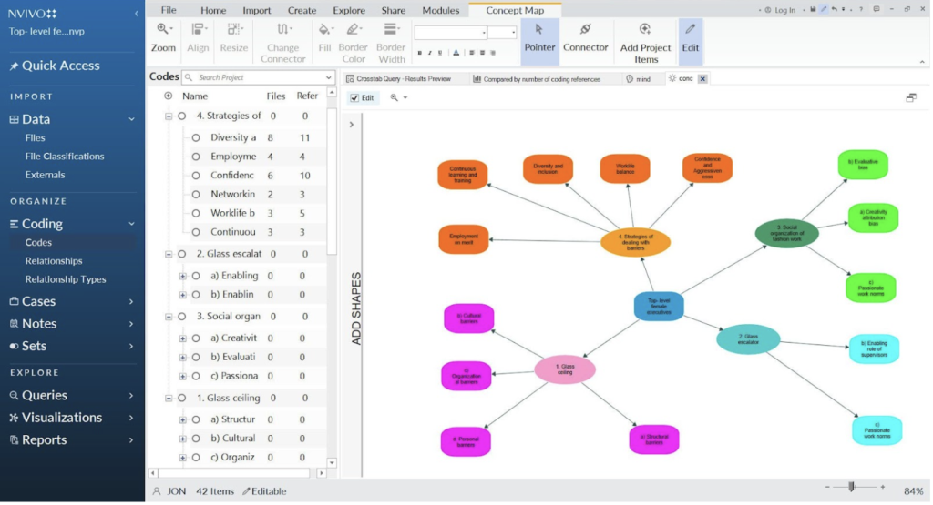 NVivo is a qualitative data analysis software platform designed to help researchers organise, code and analyse unstructured data. It has been used both with academic research, as well as market and industry-based projects, government and healthcare. It can manage interviews, focus groups, surveys, social media content and other text, audio and mixed media sources.