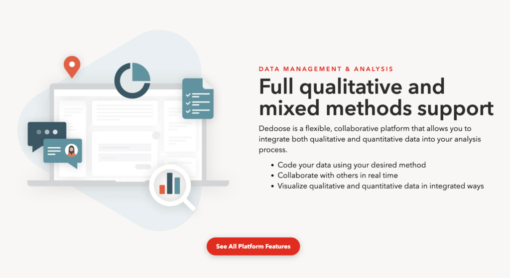 Dedoose is a web-based qualitative research and mixed methods analysis platform designed for academic and applied research settings. It’s run through a browser, making it easier for distributed teams who need shared access without installing software locally.