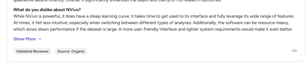 “While NVivo is powerful, it does have a steep learning curve; it takes time to get used to its interface and fully leverage its wide range of features.”
